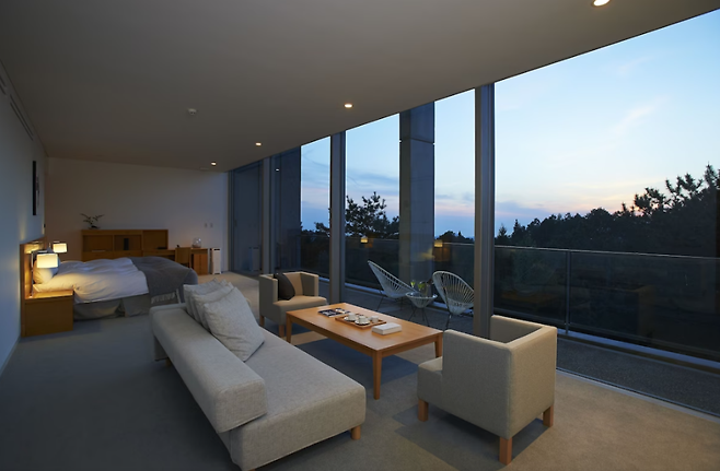 '일본의 가우디'로 불리는 안도 타다오는 1995년 프리츠커상을 수상했다. 그가 설계한 정교한 디자인을 곳곳에서 면밀히 살펴볼 수 있다. '노출 콘크리트의 거장'답게 별다른 장식 없는 깔끔한 벽과 통창뷰만이 조화를 이루고 있다. 화려하지 않아 오로지 자연 풍광만이 눈에 꽂힌다. 안도 타다오의 여정이 녹아든 공간이 완벽한 휴식처이자 여행지가 된다. 모든 객실에서 오션뷰를 감상할 수 있다. '바다멍(바다를 바라보며 멍때리기)'의 끝판왕을 지나칠 수 없다면 더 늦어지기 전에 서둘러보자.