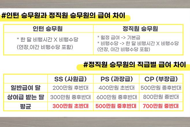 인턴 승무원의 시간당 비행 수당이 높은 이유는 비행 수당으로만 구성돼 있기 때문에 비행 수당이 너무 적을 시 급여가 낮기 때문인데요.
