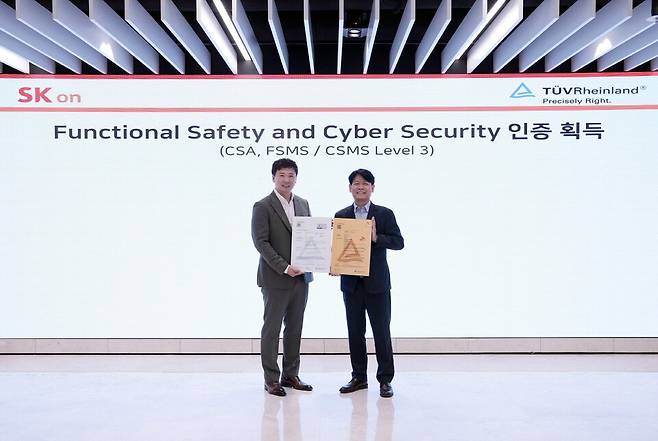 SK온은 글로벌 시험∙인증 전문기관 TUV 라인란드로부터 사이버 보안 인증(CSA), 기능 안전 관리 체계(FSMS, Functional Safety Management System) 레벨3 인증 등 총 두 건의 국제 인증을 획득했다고 10일 밝혔다.