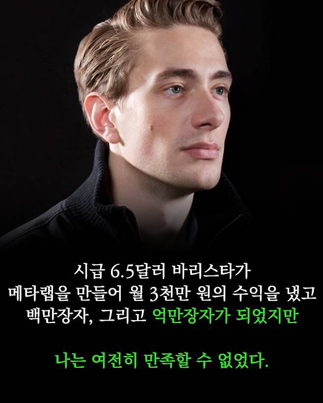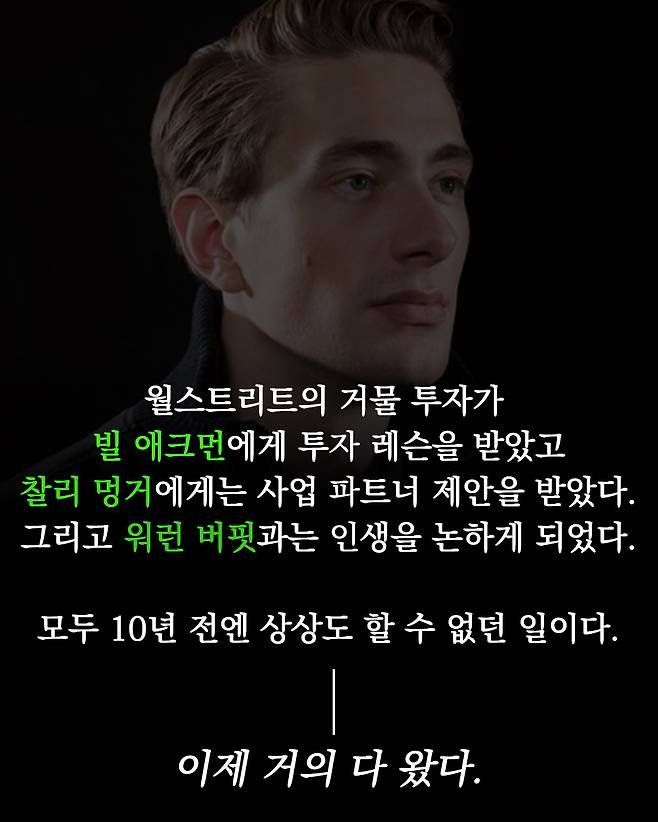 시급 6.5달러짜리 카페 아르바이트생에 불과했던 그는약 10년 만에 실리콘밸리의 전설적 투자가 빌 애크먼과 투자를 논하고,투자의 신 찰리 멍거에게 사업 파트너 제안을 받는 드라마틱한 인생 역전의 주인공이 되었습니다.