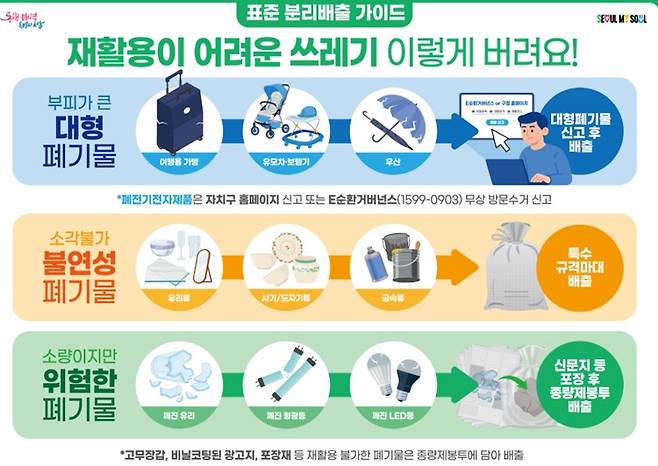 이를 해결하기 위해 서울시는 자치구마다 제각각이었던 '재활용이 어려운 품목'에 대한 배출기준을 통일하는 표준안을 마련하고, 25개 자치구에 본격적인 안내를 하고 있는데요.