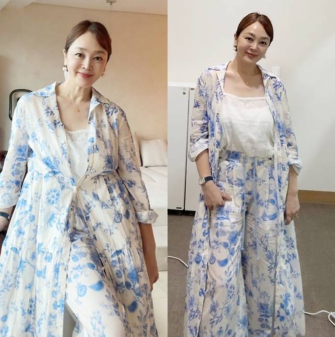 이승연은 푸른 꽃들이 은은하게 프린트된 플라워 패턴 팬츠와 셔츠 롱 원피스 셋업의 편안하고 여유로운 핏으로 우아하면서도 여성스러운 스타일을 완성했다.