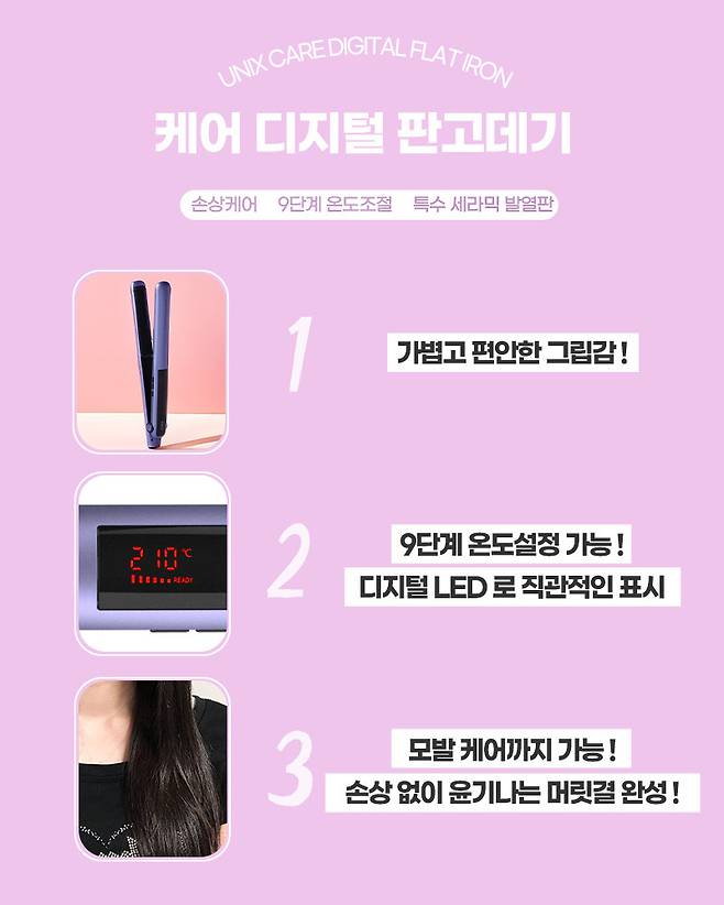 이 스타일링에서 가장 중요한 것은 얼마나 손상도 없이 부드러운 머릿결을 연출해 주느냐이다. 유닉스 케어디지털 판고데기는 손상의 걱정 없이 부드럽고 윤기 있는 머릿결을 데일리로 연출해 주기 때문에 추천하는 고데기다.