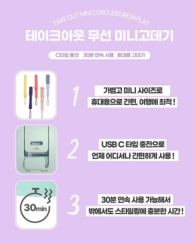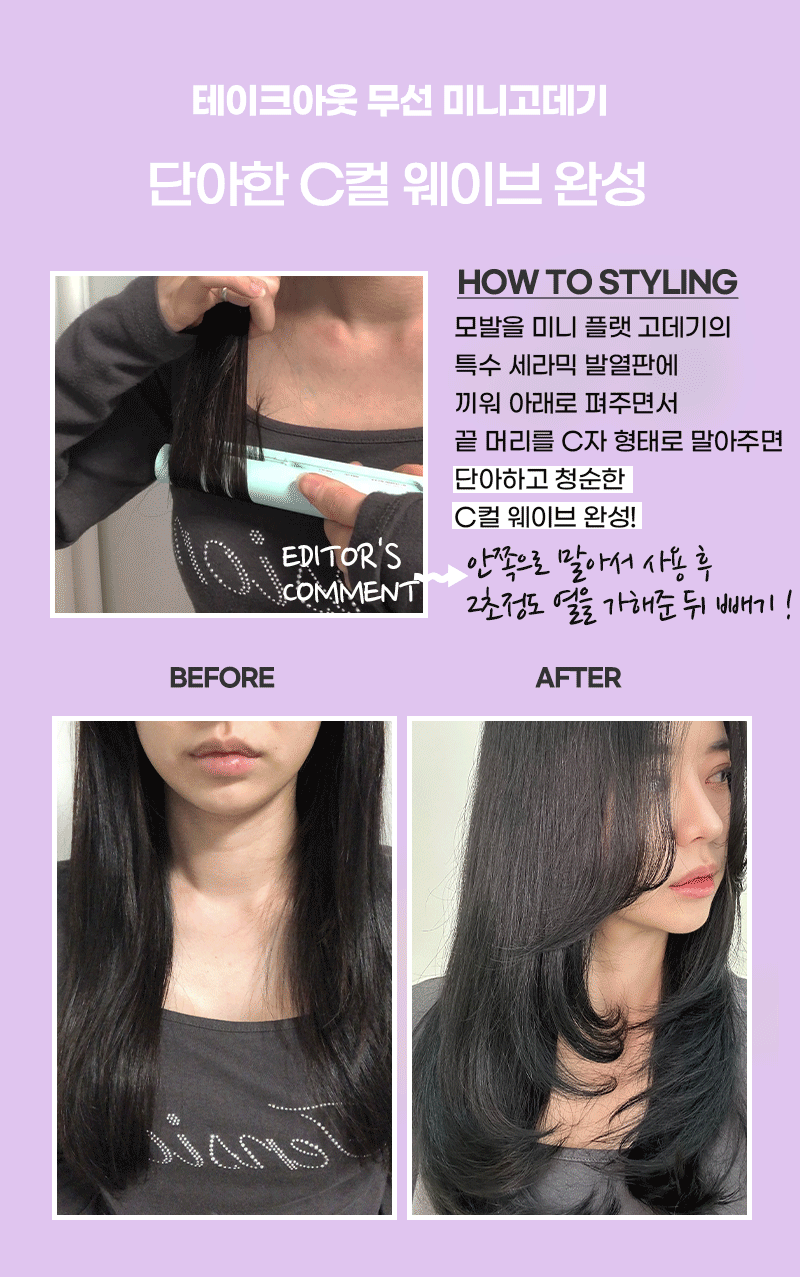 C타입 충전의 무선으로 되어있어서 휴대와 사용이 간편하고, 30분 연속 사용 가능해서 밖에서도 스타일링 시간에 걱정 없고,작지만, 보통의 판 고데기만큼의 효과를 나타내기 때문에 하나쯤 소장하고 있으면 삶의 질이 달라진다.