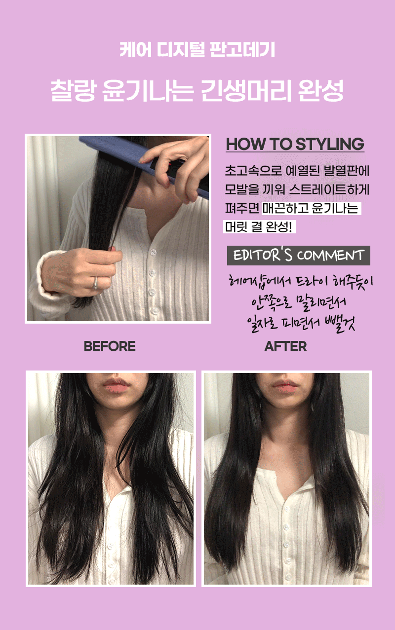 이 제품을 에디터가 데일리로 사용하고 있는 이유는 고데기를 하는 순간 거칠었던 머릿결이 코팅되듯 부드러운 머릿결로 정돈되면서 윤기 있는 모발 연출이 가능하기 때문이다. 상하좌우 무빙 발열판 덕분에 자연스럽고, 균일하게 생머리를 만들었다.
