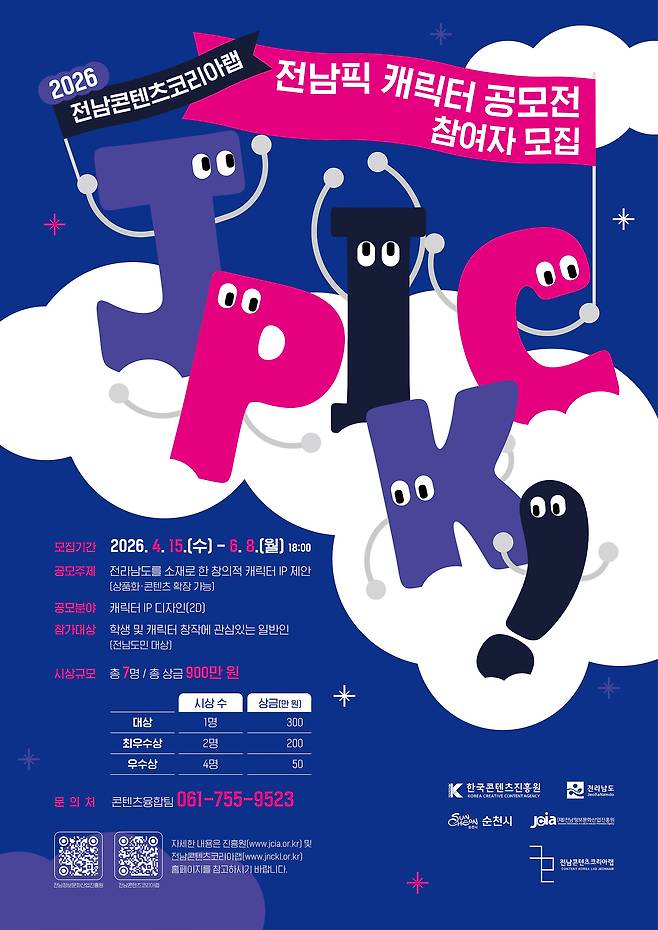 전남정보문화산업진흥원(원장 이인용, 이하 ‘진흥원’)은 전라남도의 매력을 담은 대표 캐릭터를 발굴하기 위해 ‘2026년 전남콘텐츠코리아랩 전남픽(JPICK!) 캐릭터 공모전’을 개최한다고 밝혔다.
