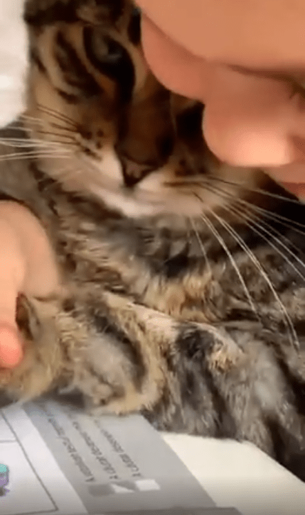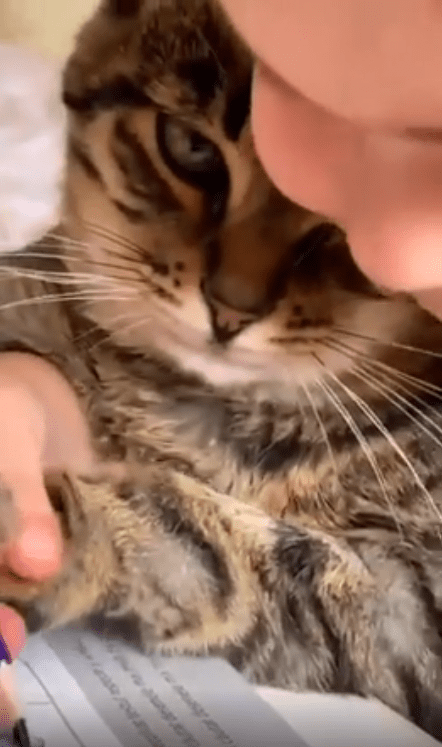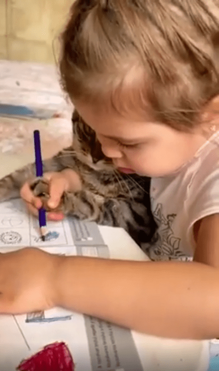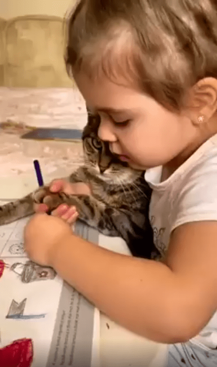 고양이는 그저 앞발에 쥐어진 색연필을 들고 있을 뿐이었고, 아이가 고양이의 손을 빌려 색칠을 하고 있었습니다.
