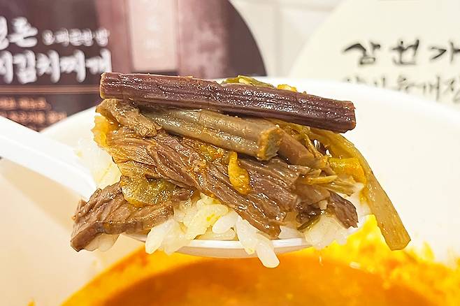 밥심은 따끈할 때 밥을 말아서 크게 한입 먹어봤는데요. 편의점 밥 특유의 맛이 조금도 느껴지지 않고 찌개에서 깊고 풍부한 맛이 나서 눈을 번쩍 떴어요! 그냥 김치가 아니라 묵은지로 끓인 찌개여서 적당히 신맛이 났는데, 속이 내려갈 정도로 시원하더라구요!