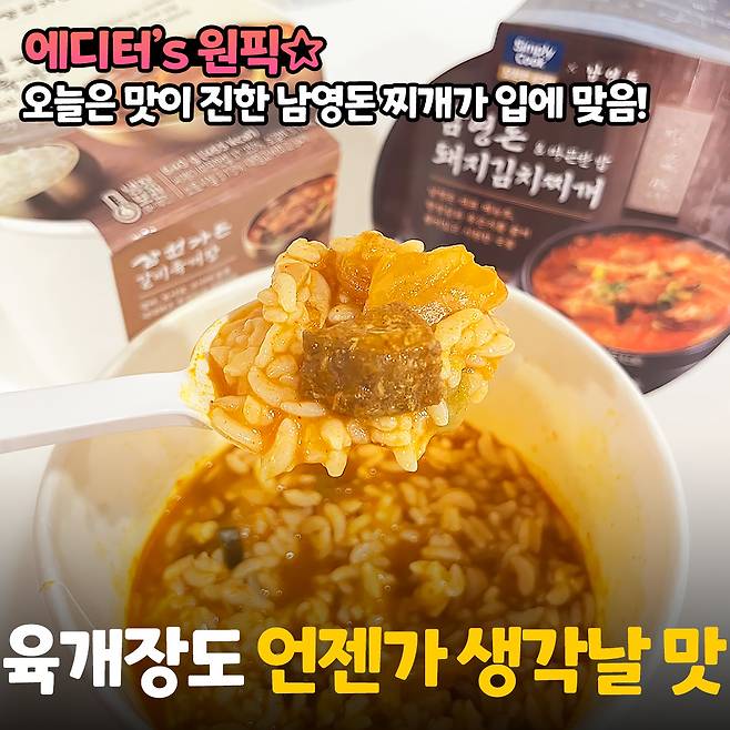 육개장은 건더기가 많아서 좋았어요. 국물은 첫입에 칼칼함이 쫙 올라와서 자꾸 먹게 되더라구요. 자취를 한다면 정말 자주 사먹을 것 같아요! 김치찌개를 편의점에서 먹은건 처음이었는데 맛있어서 너무 놀랐어요! 집에서 남영돈의 김치찌개를 먹을 수 있어서 좋아요...☆