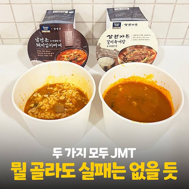 사실 GS25 심플리쿡 신상 2가지는 맛만으로 우열을 가리기가 힘들었어요. 그도 그럴 것이 남영돈과 삼원가든은 누가 봐도 '자강두천' 아니겠어요? 이번 신상은 뭐가 더 맛있다고 하기 보다는 입맛과 취향에 따라 선택지가 나뉠 것 같아요!