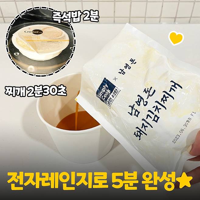 간편식 답게 조리방법도 매우 쉬워요! 제공된 종이용기에 국물 파우치를 전부 따라낸 뒤 전자레인지에 2분30초를 돌려주세요!