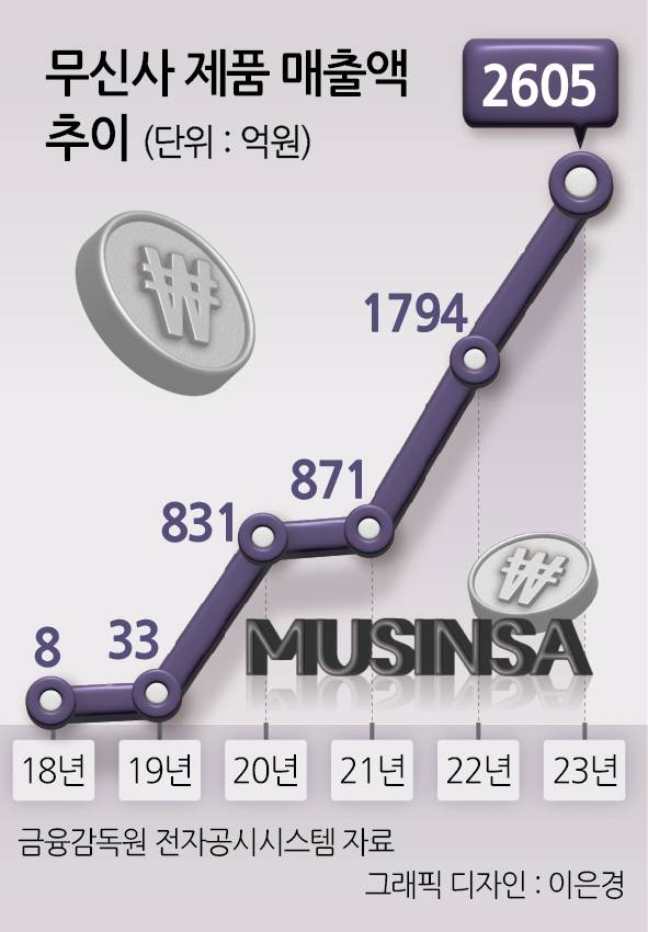 지난해 4월 금융감독원 전자공시시스템에 게재된 감사보고서에 따르면 무신사의 제품 매출은 2023년 기준 2605억원이었습니다. 2023년 전체 매출(9931억원)의 약 26.2%입니다. 2018년 8억원에 불과하던 제품 매출은 2019년 33억원, 2020년 831억원, 2021년 871억원을 기록하다가 2022년 1794억원으로 전년 대비 2배 가까이 급증했습니다.