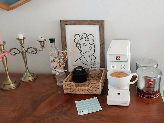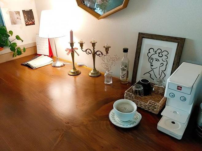 캡슐 커피 머신을 두고 매일 사용하고 있어요.식탁이 우리 소지품을 놓아두는 공간이 되고 있지만 한 번씩 정리하며 예쁜 공간으로 꾸미고 있어요.