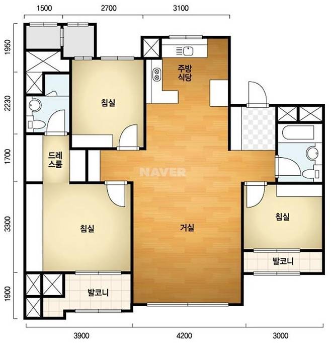 29평의 확장형 아파트입니다. 침실 3개와 거실과 주방으로 이루어져 있어요.