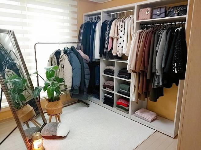 처음에는 행거를 설치해서 옷을 걸어두고 사용했는데 조금 더 깔끔하게 정리해 보고 싶어서 드레스룸도 쉬는 동안 다시 정리했어요.