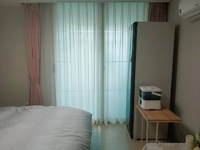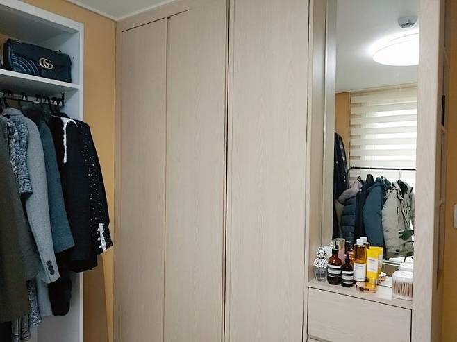 한쪽에 설치된 붙박이장에는 여름옷을 넣어서 정리하고 화장대 겸 사용하고 있어요. 사실 화장대를 잘 사용하지는 않아요. 거실에서 TV 보면서 상을 이용하고 있어요 :)