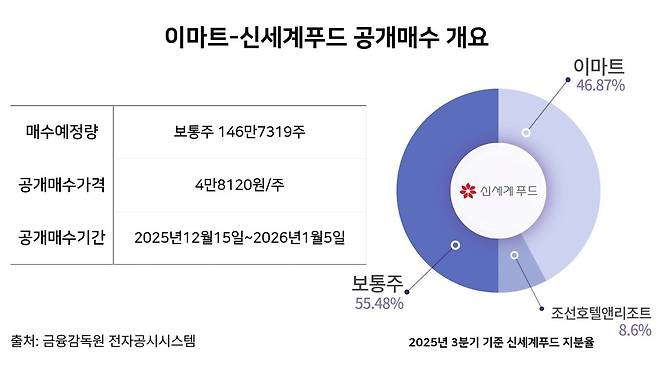 공개매수 기간은 이날부터 내년 1월5일까지다. 이마트는 공개매수를 통해 유통주식 전량을 취득하게 된다. 회사는 신세계푸드를 완전자회사로 편입한 뒤 상장폐지를 할 계획이다. 지분율 95% 이상 등 자발적 상장폐지 신청 요건을 충족하면 상장폐지 심사를 신청할 수 있다.