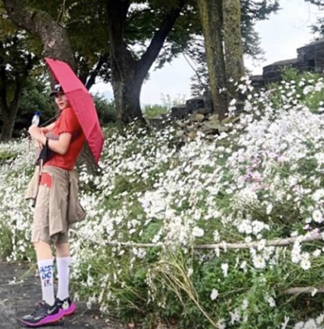 김혜수는 레드 컬러 등산복을 입고 아이보리 바지에 보라색 운동화로 애슬레저룩을 완성했다.