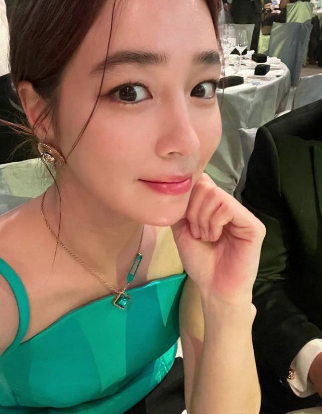 이민정은 핑크빛 메이크업으로 청순한 분위기를 자아냈고, 에메랄드빛 드레스에 맞춰 목걸이를 매치했다.