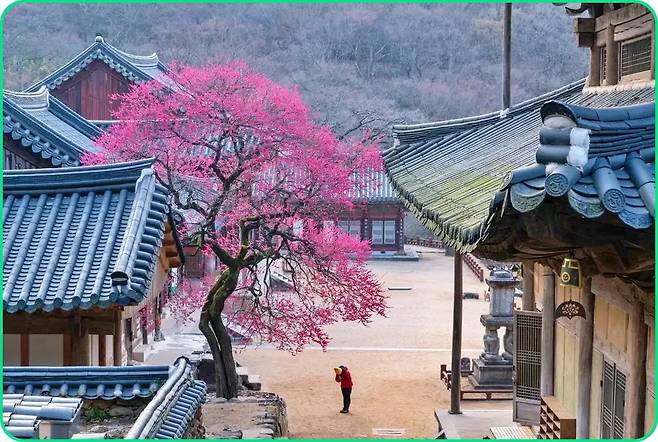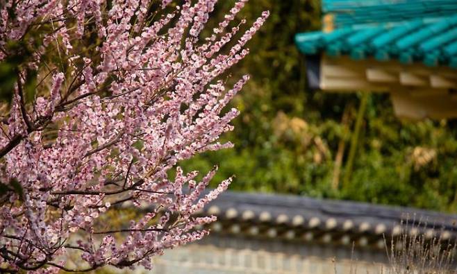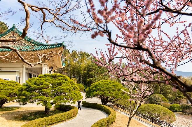 입구를 지나면 잘 정돈된 정원과 함께 웅장한 충렬탑이 방문객을 맞이한다. 단아한 기와지붕 건물과 분홍빛, 흰빛 매화가 어우러진 풍경은 전통 건축의 아름다움을 더욱 돋보이게 한다.