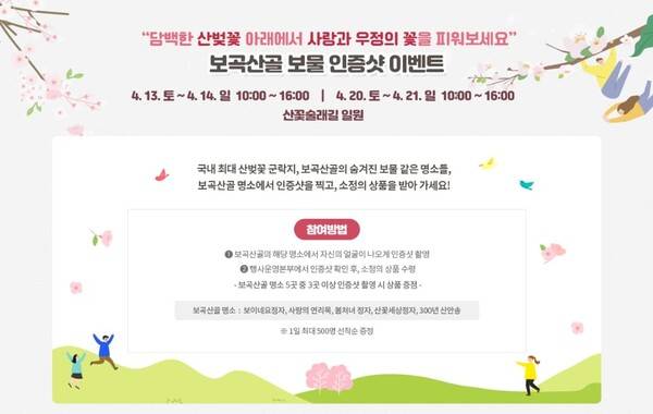 특히 많은 사람들의 이목의 끌고 있는 이벤트는 보물 인증샷 이벤트라고 합니다. 이 이벤트는 보곡산골의 산벚꽃이 가장 아름답게 볼 수 있는 명소 5곳 중 3곳이상 인증샷을 촬영하면 상품을 증정한다고 하는데요. 봄꽃과 함께 상품도 노리러 가보는 것은 어떨까요?