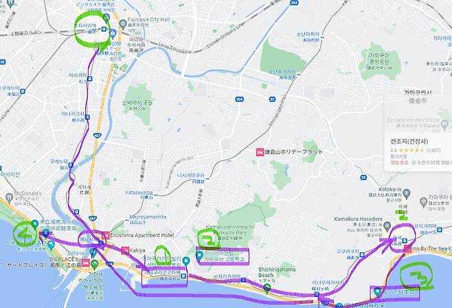 이번 일정은 후지사와 -> 카마쿠라 코코마에 -> 하세 -> 에노시마 해변 으로 도는 일정이었습니다.