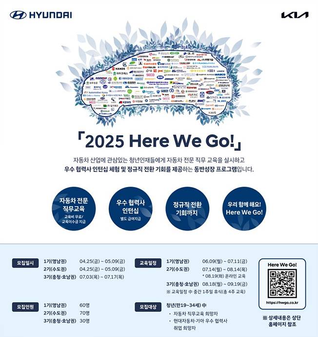 현대차·기아가 청년 인재에게 양질의 직무 경험을 제공하고 협력사에게는 검증된 인재 채용 기회를 제공하는 동반성장 프로그램 ‘2025 Here We Go!’를 본격 확대 운영한다고 25일 밝혔다. 지난해부터 시작된 이 프로그램은 자동차 산업에 관심 있는 만 19세부터 34세의 청년들에게 직무 교육과 협력사 인턴십 기회를 연계해 제공함으로써, 산업 전반의 인력 수급 불균형을 해소하고 협력사의 채용 안정성 강화에 기여하고 있다.