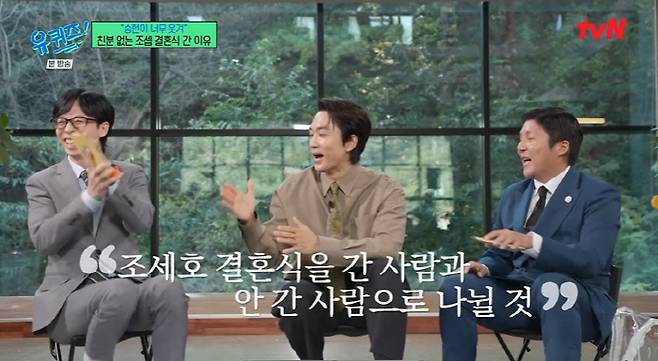 송승헌은 "이동욱에게 이렇게 성대한 결혼은 처음봤다라고 했더니 이동구이 '900~1000명이 왔다'고 하더라. 그래도 난 다녀왔으니까. 너무 좋았다. 정말 잘 간 것 같다. 우리나라 대중문화는 조세호 결혼식을 간 사람과 안 간 사람으로 나뉠 거 같다"라고 너스레를 떨어 웃음을 자아냈다.