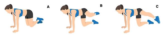 1. 양손을 어깨 아래 위치하고 무릎을 굽혀 테이블 자세를 만든다.