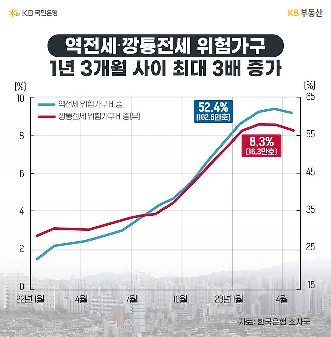 한국은행이 발간한 2023년 5월 경제전망보고서 중 ‘금융·경제 이슈분석' 내 '깡통전세·역전세 현황 및 시사점’에 따르면, 계약기간이 남은 전세계약 중 깡통전세 위험가구 비중은 2022년 1월 2.8%(5만6000호)에서 올해 4월 8.3%(16만3000호)로 급증한 것으로 나타났습니다. 역전세 위험에 있는 가구 비중도 같은 기간 25.9(51만7000호)에서 52.4%(102만6000호)로 크게 높아졌고요. 특히 올해 하반기와 내년 상반기에 상당부분 만기가 도래하는 것으로 나타나면서 전세보증금 미반환 리스크는 더욱 커질 것으로 보입니다.