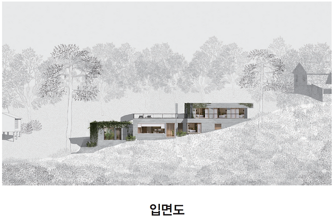 비정형적인 지형을 고려해 매스는 크게 세 덩이로 나눴다. 각 매스의 방향과 연계는 기능적일 뿐만 아니라 지형에도 자연스럽게 대응한다. 각 높낮이에서 자유롭게 진출입하는 테라스와 같은 ‘반열림’ 공간이 그 예에 해당한다. 내부 역시 세 덩이의 매스는 서로 계단으로 연결된다.