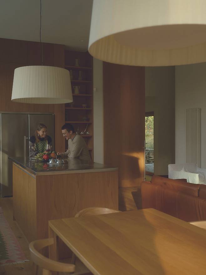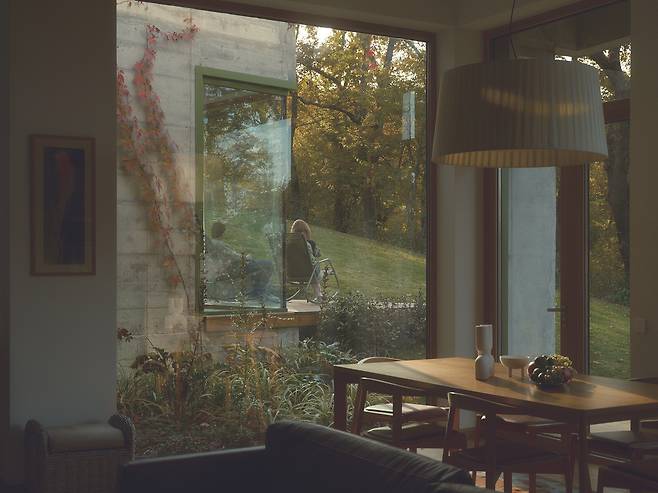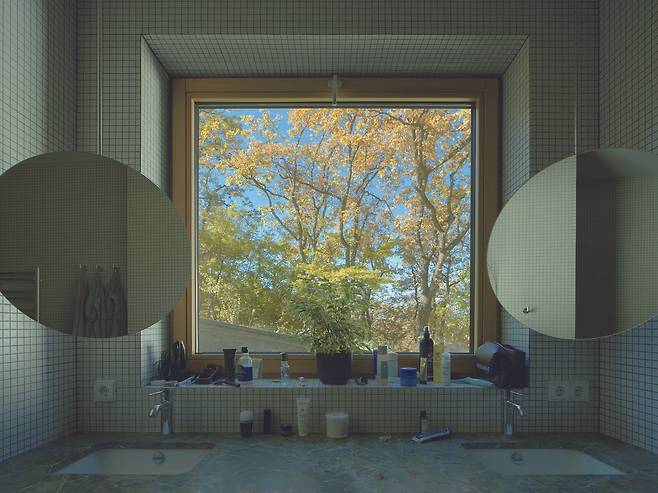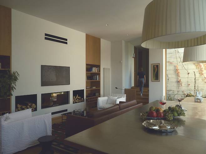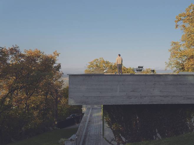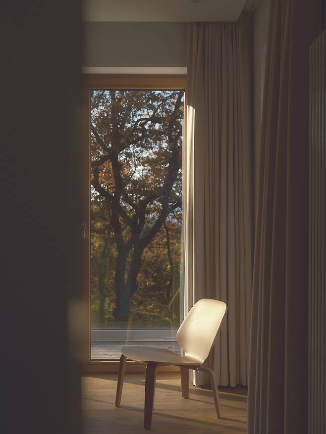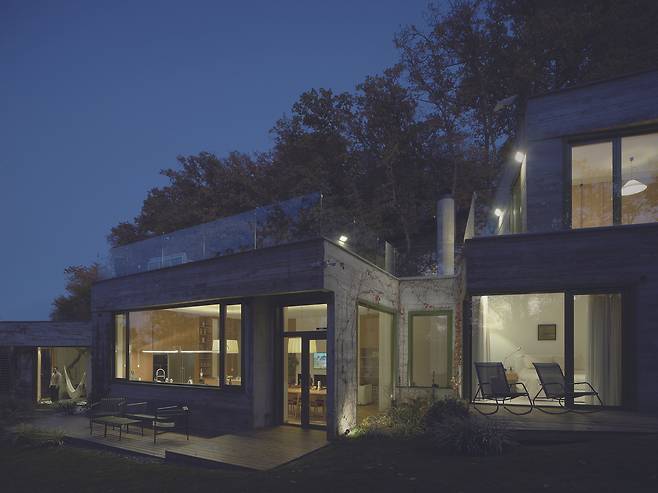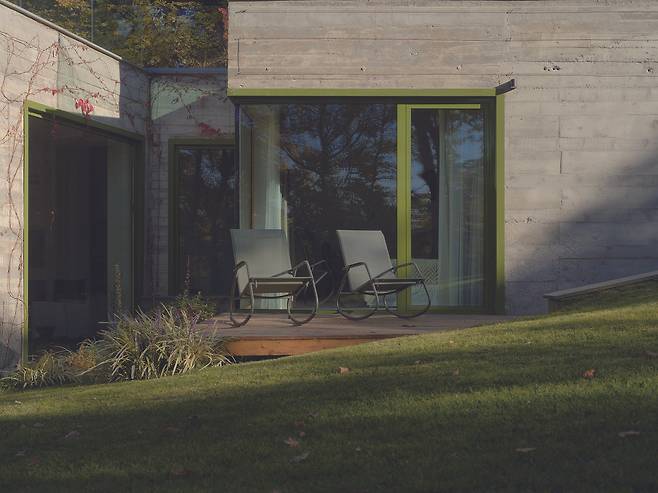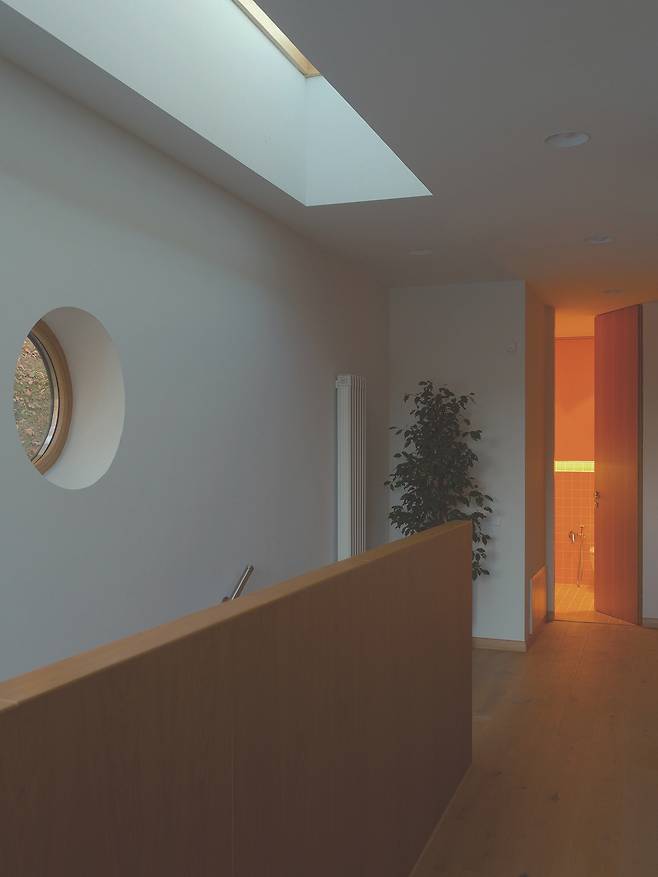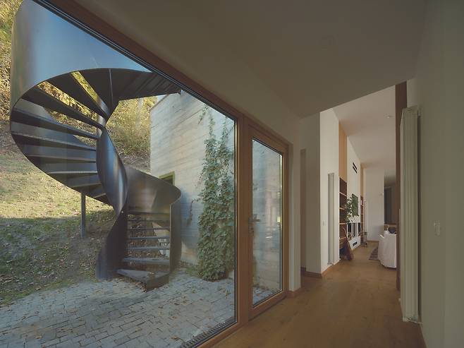서로 다른 높낮이로 앉혀진 덕분에 주택은 대지의 일부인 듯 보인다. 각 매스를 잇는 복도에는 큰 창을 설치해 도로와 계곡을 향한 트인 전망을 제공하는 등 주변과 적극적으로 소통한다.
