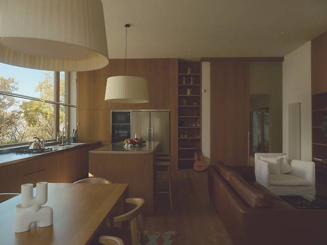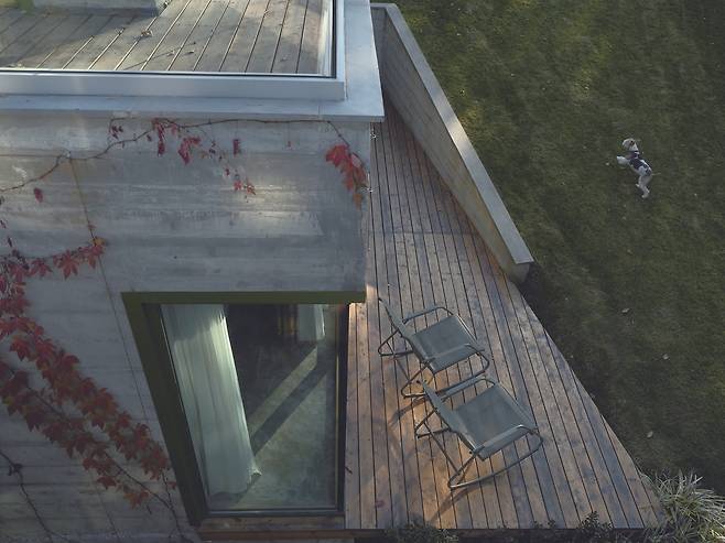 서로 다른 높낮이로 앉혀진 덕분에 주택은 대지의 일부인 듯 보인다. 각 매스를 잇는 복도에는 큰 창을 설치해 도로와 계곡을 향한 트인 전망을 제공하는 등 주변과 적극적으로 소통한다.