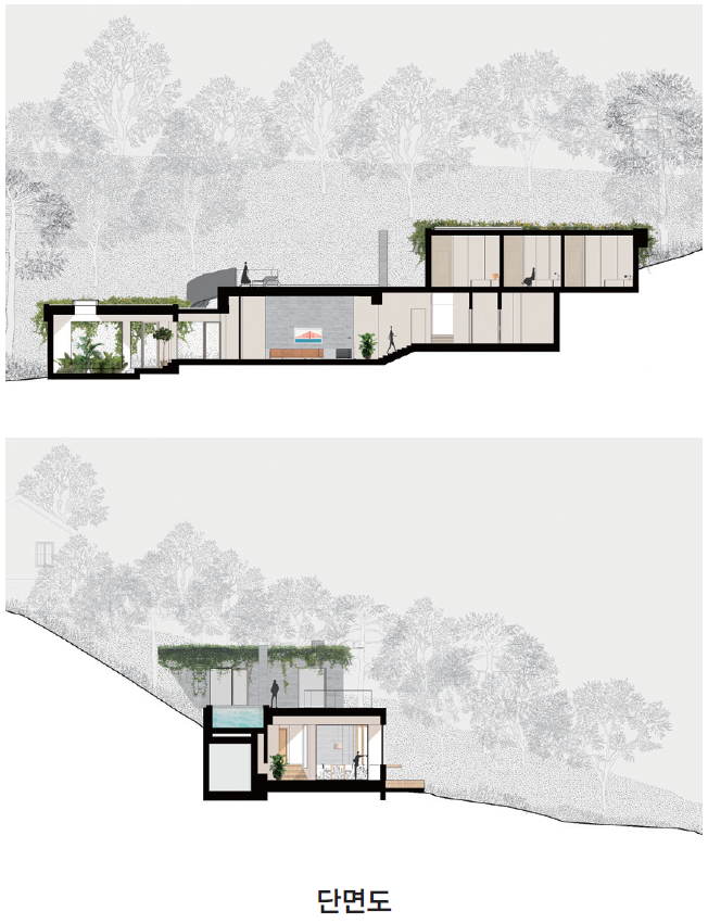 비정형적인 지형을 고려해 매스는 크게 세 덩이로 나눴다. 각 매스의 방향과 연계는 기능적일 뿐만 아니라 지형에도 자연스럽게 대응한다. 각 높낮이에서 자유롭게 진출입하는 테라스와 같은 ‘반열림’ 공간이 그 예에 해당한다. 내부 역시 세 덩이의 매스는 서로 계단으로 연결된다.