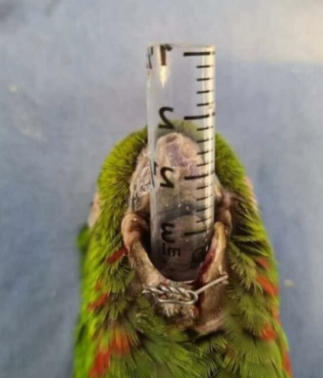 그는 앵무새의 아래턱 양쪽에 구멍을 뚫고, 의료용 철사를 넣어 갈라진 두 턱을 단단히 고정했습니다.