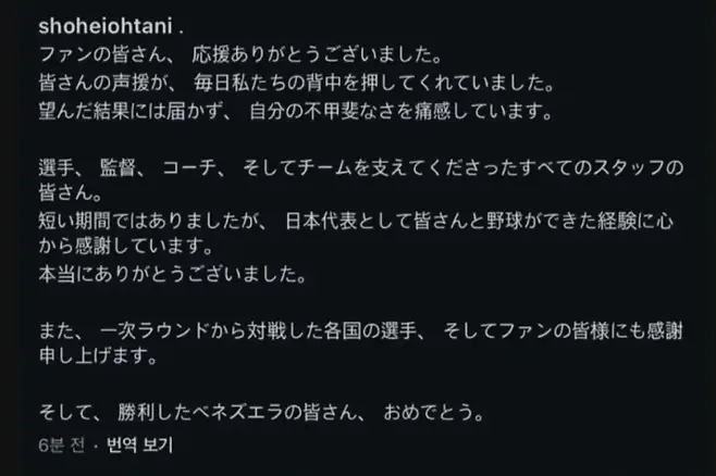 오타니는 소셜미디어 글에서 선수들과 코칭스태프, 그리고 각국 선수들에게도 감사 인사를 전했다. 특히 "승리한 베네수엘라 여러분, 축하드립니다"라며 상대팀에 대한 존중도 잊지 않았다.