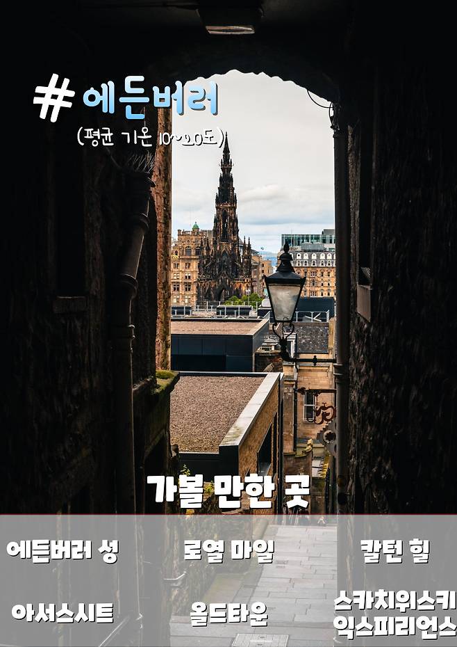 여름에 가기 좋은 해외 여행지로 에든버러의 장점은 여름에는 시원하고 해가 늦게 지기 때문에 활동 시간이 길다는 것인데요. 이점을 이용하여 에든버러 성을 방문하거나, 아서스 시트 등산, 로열 마일 산책 등 다양한 활동을 즐길 수 있죠.