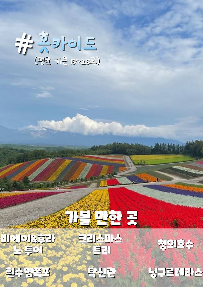 이 외에도 눈이 오지 않는 여름 북해도 여행은 날씨가 쾌적하여 오히려 겨울 홋카이도 여행보다 훨씬 만족할 수 있답니다. 이 시기에는 많은 비에이 투어 상품이 나오지만, 자유 여행을 통해 즐겨 보는 것도 추천해 드립니다.