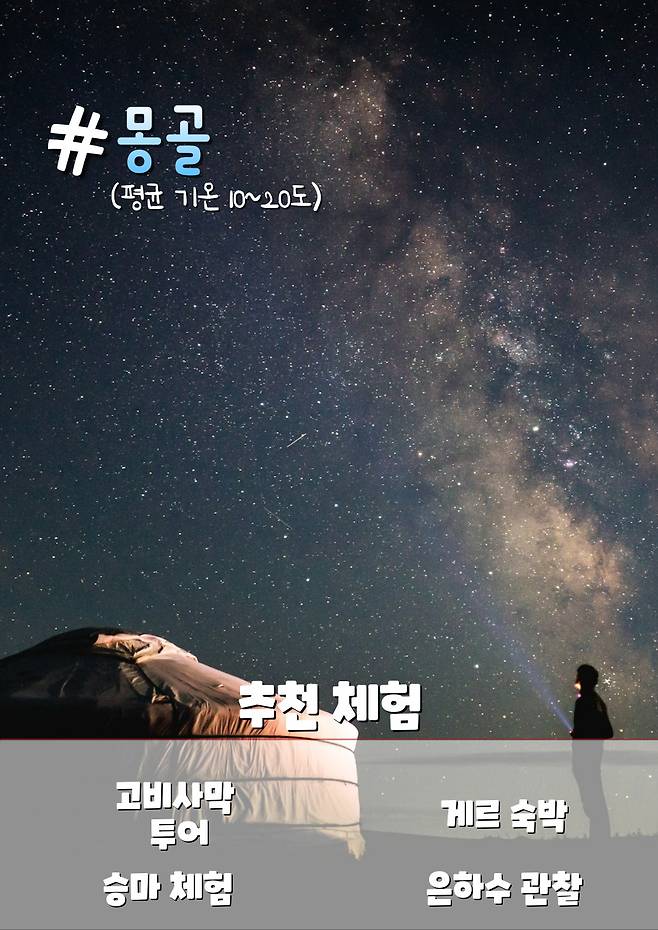 광활한 초원과 유목민 문화, 맑은 하늘로 유명한 몽골은 천혜의 자연경관을 경험할 수 있는 곳입니다. 특히 최근 인기가 많아진 고비 사막 투어에서는 사막의 독특한 지형과 별빛 아래 캠핑을 즐길 수 있는데요. 몽골 전통 게르(몽골족의 이동식 전통가옥)에서 머무르며 밤하늘 가득한 별을 감상하는 것은 쉽게 접하기 어려운 체험이죠.