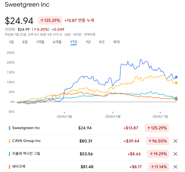 올해 들어 주요 패스트캐주얼 기업의 주가는 빠른 매장 확장과 높은 소비자 수요에 힘입어 급등세를 보여왔습니다. 올해 들어 치폴레와 쉐이크쉑은 각각 20%, 18%가량 올랐고요. 카바는 약 96%, 스윗그린은 125% 정도 폭등했습니다. 이 두 기업의 수익률은 한때 인공지능(AI) 대장주 엔비디아도 능가했습니다.