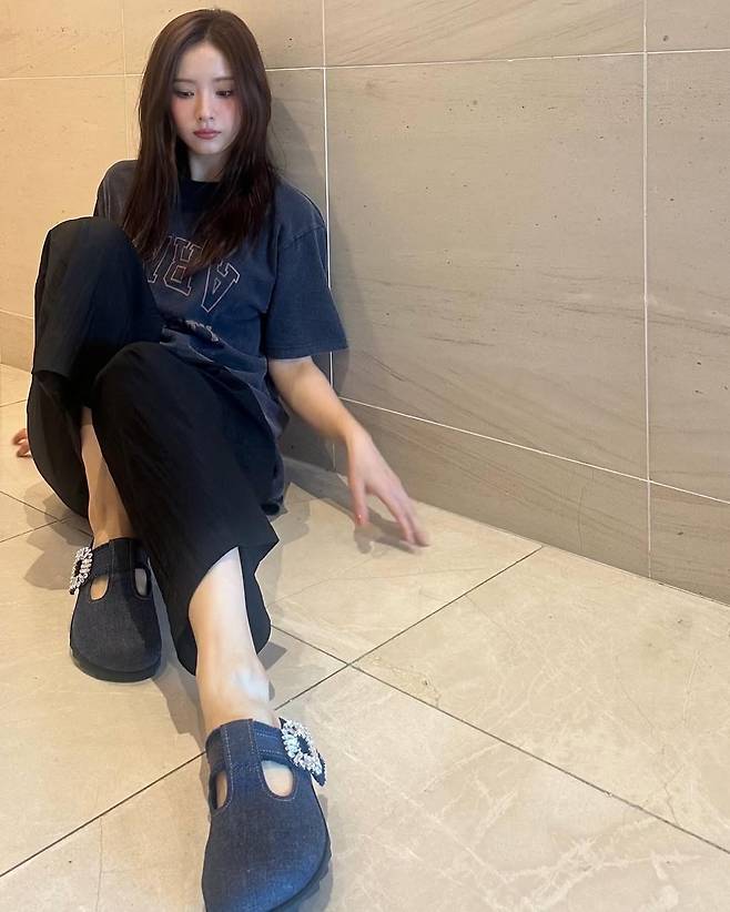 편안한 블랙 팬츠에 빈티지 티셔츠, 그리고 데님 소재의 플랫 슈즈를 매치한 그의 모습은 꾸미지 않은 듯 자연스러우면서도 독보적인 무드를 자아낸다.