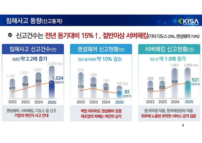 사이버 침해사고 신고 건수가 최근 3년간 2.2배 늘어나면서 올해 상반기 기준 1034건에 달한 것으로 나타났다. 유형별로는 서버해킹이 절반 이상을 차지했고 기타 분산서비스거부(DDoS) 공격이 23%, 랜섬웨어가 7.9%를 기록했다. 특히 결혼·취업 정보, 통신사, 온라인 서점 등 국민 생활과 밀접한 분야에서 사고가 집중되면서 이용자 불편과 피해가 커졌다.