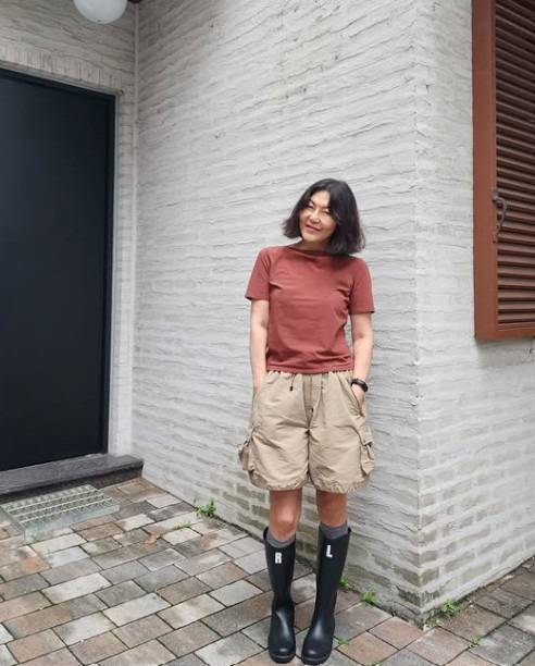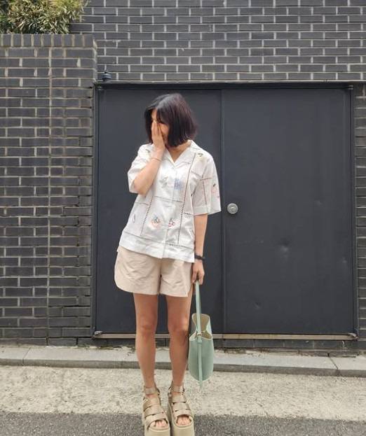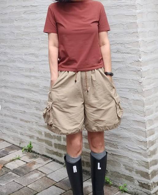 베이지 컬러의 반바지를 매치했어요. 포켓 디테일이 매력적인 카고 팬츠는 편안함과 멋을 동시에 표현해요.
