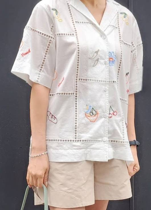 셔츠의 귀여운 자수 포인트는 알록달록한 컬러감으로 산뜻함을 표현하네요.