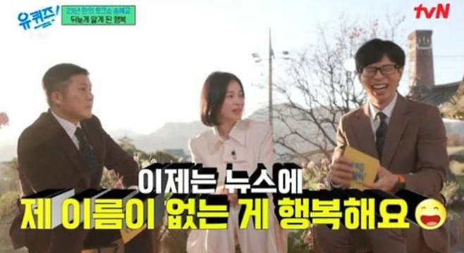 또한 송혜교는 "예전에는 항상 이야기에 내가 나오고, 언론에 내 이름이 나오는게 너무 좋았는데 이제는 모든 뉴스에 내 이름이 없는 게 행복하다. 아침에 눈 떠서 보게 되면 '내 이름이 없다 행복하다' 한다. 별일 없이 그냥 조금은 지루해도 소소한 하루를 보내는 게 정말 행복하다는 걸 느낀 지 얼마 되지 않았다"고 하자, 유재석은 "송해탈, 송직진이다"라며 새로운 별명을 언급해 웃음을 안겼습니다.