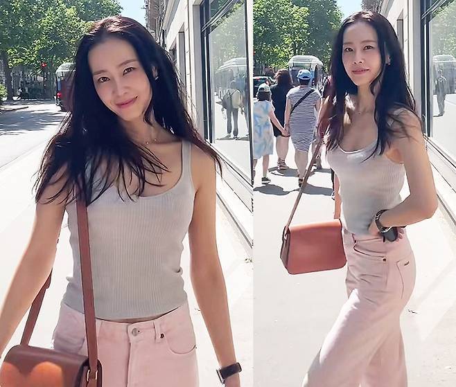 홍수현은 은은한 그레이 컬러의 슬림한 골지 슬리브리스 탑과 연핑크 와이드 팬츠로 내추럴하면서도 세련된 미니멀 룩을 완성했습니다.