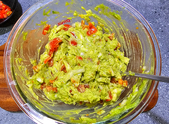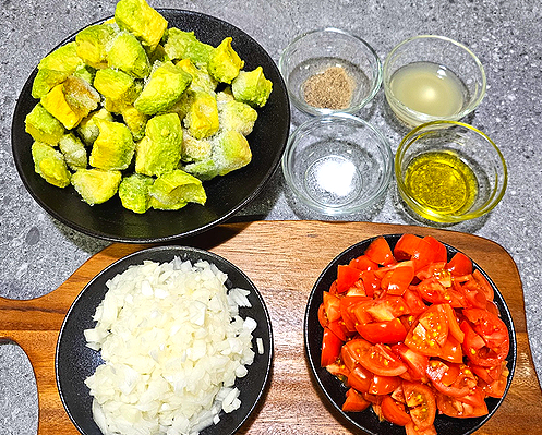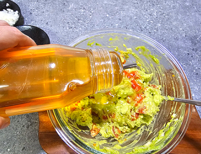 해동한 아보카도를 으깬 뒤→ 소금, 후추, 올리브유, 레몬즙 넣고 섞어요→ 다진 양파와 토마토 넣고 마무리→ 기호에 따라 꿀 약간 넣으면 은은한 단맛이 살아나요