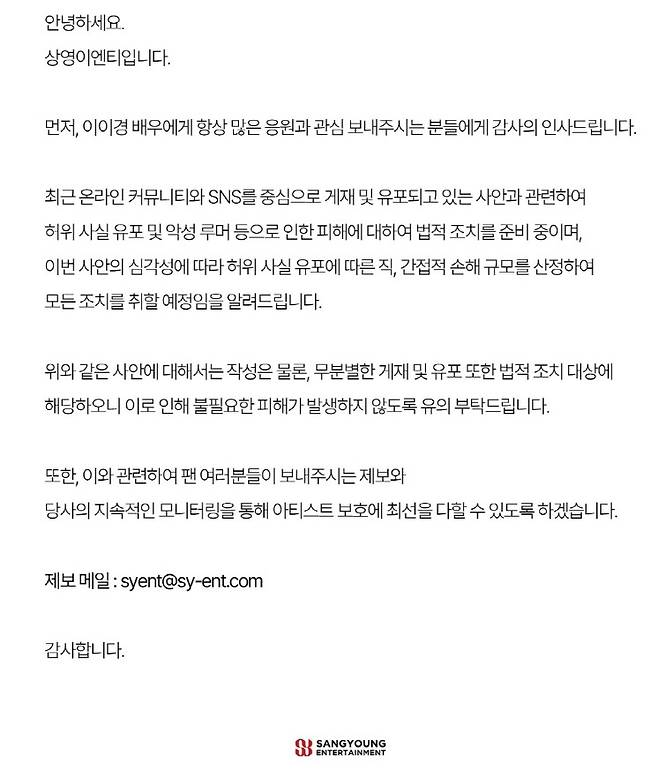 결국 소속사가 칼을 빼들었습니다. 상영이엔티 측은 "온라인에 퍼진 폭로글은 완벽한 허위사실이다. 허위 사실 유포 및 악성 루머 등으로 인한 피해에 대하여 법적 조치를 준비 중이며, 이번 사안의 심각성에 따라 허위 사실 유포에 따른 직·간접적 손해 규모를 산정하여 모든 조치를 취할 예정임을 알려드린다"라고 입장을 밝혔습니다.