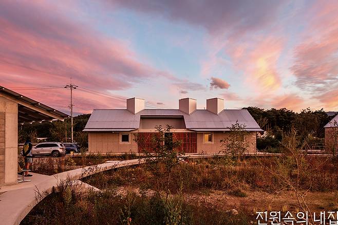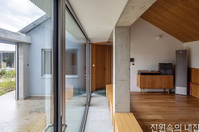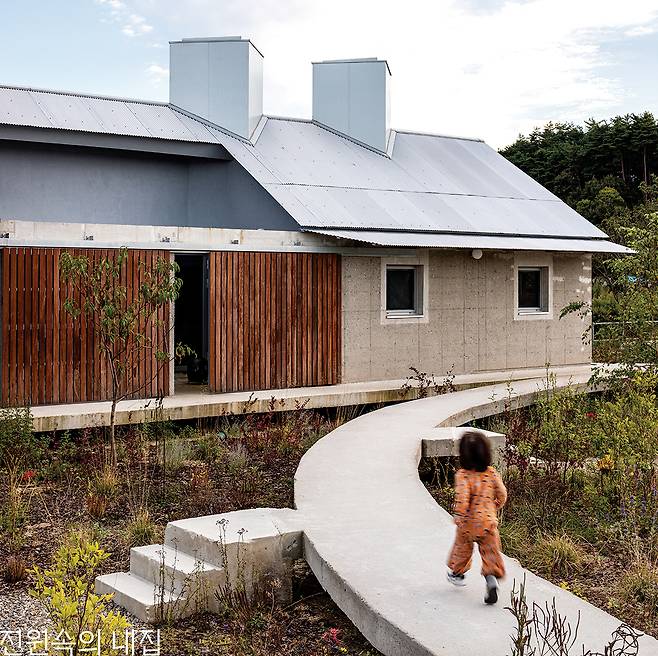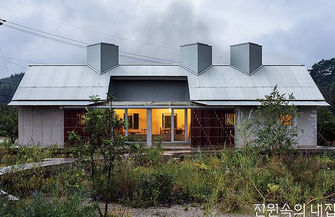 콘크리트로 마감된 외관은 시골에서 익숙한 대칭의 곡물 창고처럼 주변과 이질감이 없지만, 은갈치처럼 빛나는 골강판 지붕과 각을 달리한 처마가 기계적인 느낌을 더해 집은 세련되면서도 둔탁하고 익숙하면서도 생경하다. 저 멀리 눈 오는 정원을 보며 거실에서 음악을 듣다가 큰 나무 대문을 밀어 닫으면 펜션과 완전히 분리된 작은 중정이 비로소 집안으로 폭 품어진다.