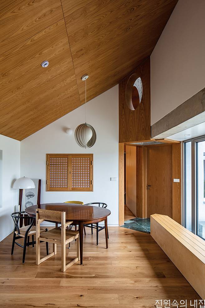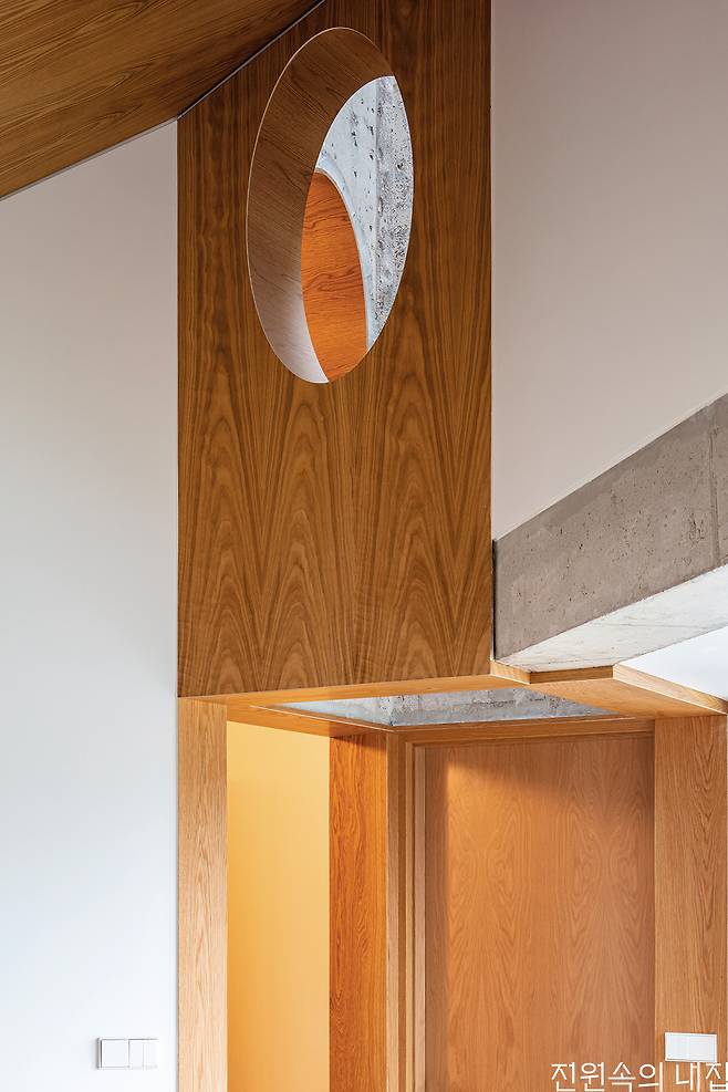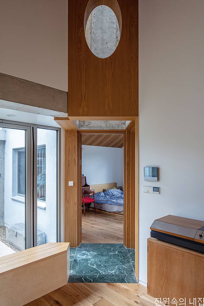방 모서리 사이에 끼어들어 간 다이아몬드 모양의 초록 대리석 바닥 공간은 각 방으로 들어가는 문이 한데 모인 작은 전실로, 이곳을 통해 밤에는 별을 보고 낮에는 빛을 들인다. 지붕을 뚫고 솟아오른 모습이 밖에서 보면 거대한 배의 굴뚝처럼 보이기도 한다. 빛 굴뚝의 거실 측 벽면에 난 타원형 개구부는 자연스럽게 조명이 되어 거실의 경사진 높은 천장을 어스름하게 밝히고, 이와 함께 작은 한식 창과 중정, 그리고 콘크리트 기둥이 만들어내는 거실은 서양적인 듯하면서도 동양적이다.